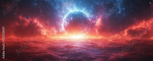 Futuristic Abstract Digital Landscape with Glowing Sphere and Cosmic Background