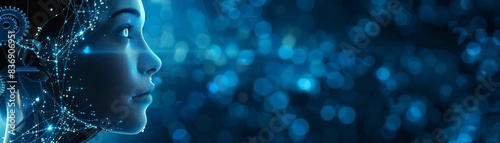 futuristic, ai, concept, female, face, engulfed, blue, light, matrix, symbolize, modern, automation, computer, generate, creativity, progress, android, vision, robotic, artificial, visualisation, evolution, virtual, reality, technology