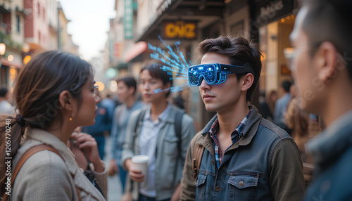 Futuristic AR Glasses in a Busy Urban Setting with Digital Interface Display