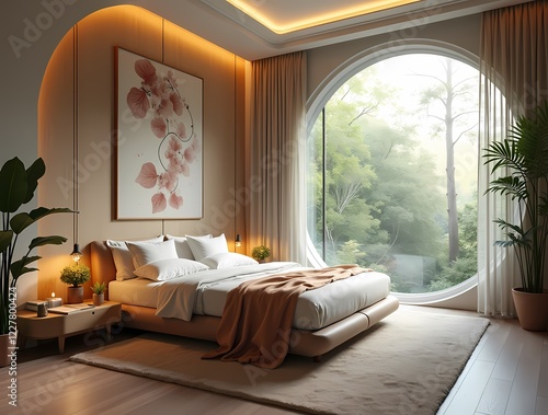 Futuristic bedroom with ergonomic bed surrounded by nature inspired decor promoting relaxation and mindfulness, general plan
