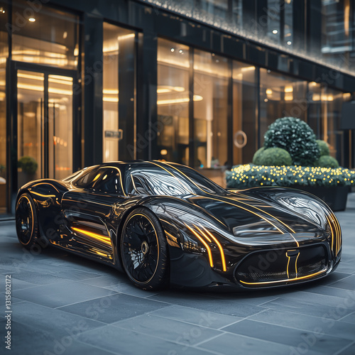 sports car, luxury, black, gold, futuristic, automotive, sleek, modern, urban, city, exotic, fast, design, innovation, stylish, speed, performance, technology, high-end, elegance, power, aerodynamic, cutting edge, sophisticated, expensive, transportation, reflective, metallic, exclusive, premium, street, evening, headlamp, prestige, detailed, sharp, concept, unique, dynamic, car, visionary