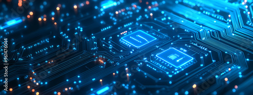 futuristic, blue, circuit, board, design, intricate, pattern, glowing, line, complex, high technology, electronic, dynamic, energy, technology, modern, digital, wiring, connection, component, network, datum, flow, innovation, precision, generative, ai