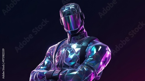 Futuristic character in neon armor on a dark background