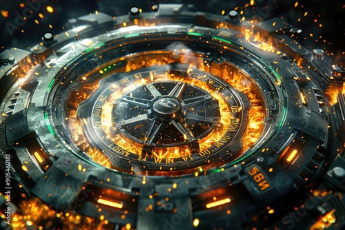 futuristic, mechanism, circular, fire, spark, technology, science fiction, abstract, industrial, metal, gear, cog, wheel, glowing, orange, black, digital, design, three-dimensional, rendering, energy, power, complex, intricate, pattern, texture, background, wallpaper, artwork, graphic design, science fiction, abstract art, digital artwork, fantasy, innovation, future, progress