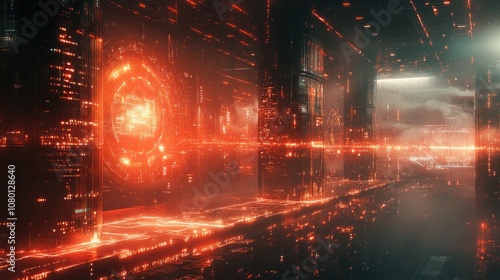 futuristic, city, corridor, glowing, light, red, portal, distance, neon, science, fiction, technology, abstract, digital, modern, architecture, design, urban, night, dark, window, building, landscape, future, space, earth, concept, art, illustration, graphic, background, wallpaper, pattern, texture, light, effect, colours, shape, line, form, structure, style, scene, environment, virtual
