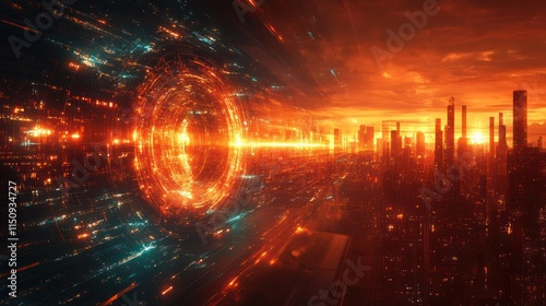 city landscape, futuristic, neon, light, orange, red, sunset, skyline, glowing, tunnel, portal, digital, technology, science fiction, abstract, datum, network, speed, motion, energy, power, artificial, urban, modern, dynamic, intense, bright, vibrant, atmosphere
