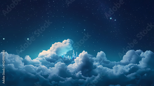 Futuristic city floating serenely amidst fluffy clouds and starlit skies. Divine Apex. Illustration
