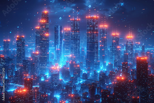 futuristic, city, silhouette, logotype, wireframe, urban, architecture, blue background, skyline, digital illustration