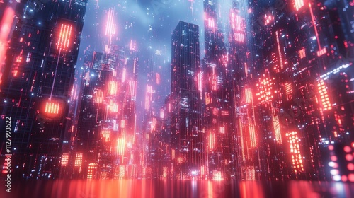 city, futuristic, neon, night, light, skyscraper, building, urban, technology, digital, glow, red, blue, modern, architecture, abstract, fantasy, science, fiction, vibrant, bright, illuminated, electric, energy, scene, view, street, landscape, background, illustration, design, graphic, art, concept, future, advanced, progress, innovation, development, atmosphere, environment, dark, sky, rain, particle
