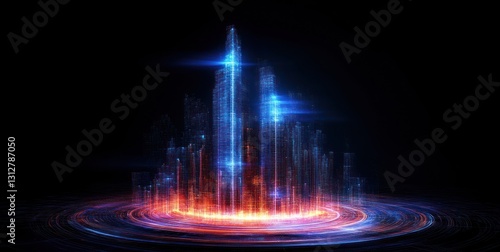 city landscape, digital, futuristic, metropolis, technology, neon, glow, light, energy, modern, innovation, progress, architecture, urban, skyline, building, night, dark, abstract, science, fiction, datum, network, connection, virtual, reality, cyber, space, future, global, earth, electric, illuminated, glowing, bright, dynamic, high-coloured, particle, line, design, graphic