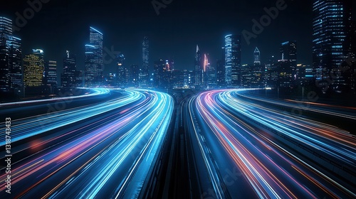 Futuristic cityscape featuring a towering skyline of skyscrapers illuminated by vibrant neon lights and high speed traffic blurring through the night