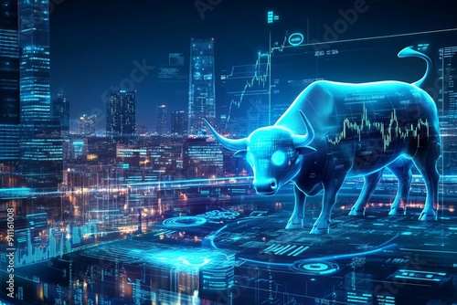 Futuristic cityscape with a giant holographic bull and financial symbols, depicting bullish market trends and forecast