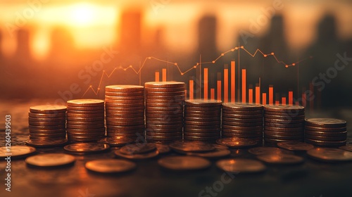 Futuristic Cityscape with Financial Graphs, A background featuring stacks of coins