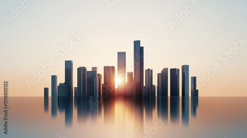 Futuristic Corporate Skyline with Skyscrapers Reflecting in Water at Sunset