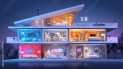 Futuristic Cross Section of a Cybernetic Smart Home Showcasing Seamless High Tech Living with Smart Lighting Automation Digital Security AI Driven Assistants and Holographic WiFi Interface