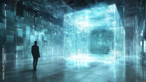 futuristic, digital, cube, abstract, space, technology, innovation, light, silhouette, figure, modern, artistic, concept, design, virtual, reality, cyberspace, glowing, illumination, holographic, reflective, composition, perspective, symmetry, minimalism, mystic, aethereal, imagination, creativity, science fiction, shiny, metallic, sleek, interior, dimensional, surreal, fantasy, innovative, tech, visionary, pattern, structure, geometry, interactive, digital artwork, abstract art