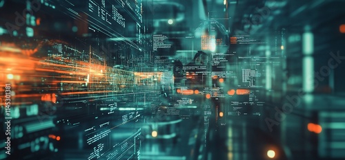 Futuristic digital landscape with data streams and glowing elements.