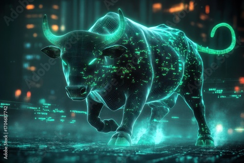 bull, digital, neon, glowing, futuristic, blue, green, technology, city, urban, wireframe, animal, strength, power, datum, cyber, light, dark, electronic, electric, abstract, modern, motion, energy, symbol, finance, market, stock, investment, network, techno, glitch, city landscape, dynamic, speed, vibrant, high technology, machine, future, digital artwork, cyberspace, virtual