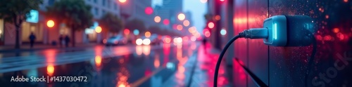 Futuristic double exposure of urban cityscape and phone charging outlet, charge, digital
