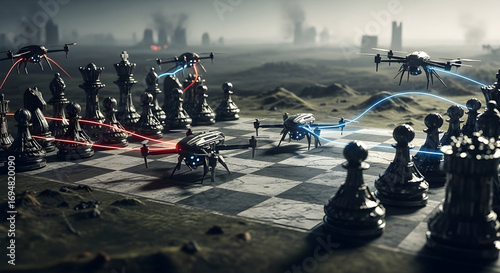 drone, chess, warfare, strategy, technology, battle, future, conflict, robot, aerial, game, military, attack, defense, surveillance, intelligence, communication, network, cyber, security, command, control, operation, mission, tactic, opponent, rivalry, competition, victory, defeat, risk, danger, threat, landscape, city landscape, ruin, destruction, apocalypse, survival, power, domination, surrender, peace, negotiation, alliance, betrayal, espionage
