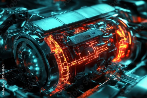 Futuristic electric vehicle engine with glowing internal components.