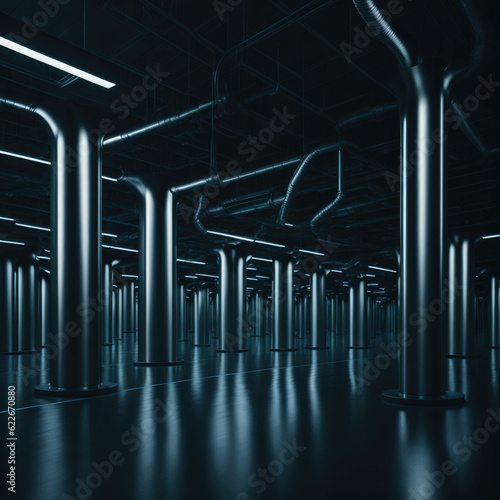 Futuristic Empty Parking, Glass And Metal Shine Texture, No Cars, Round Columns, Dark, Generative AI
