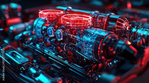 engine, car, technology, machine, automotive, futuristic, red, blue, light, glow, mechanical, part, vehicle, power, speed, innovation, design, modern, industrial, metal, chrome, detail, component, system, structure, complex, intricate, aesthetic, artistic, render, digital, three-dimensional, art, graphic, glowing, semitransparent, transparent, motor, cylinder, hardware