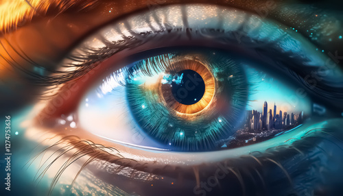 futuristic, eye, city landscape, surreal, digital artwork, vibrant, colourful, urban, skyline, fantasy, imaginative, creative, detailed, macro, closeup, science fiction, visionary, modern, technology, abstract, artistic, dreamlike, metropolis, innovation, iris, eyeball, pupil, look, vision, closeup, see, eyelash, eye, human, blue, eyelash, eyesight