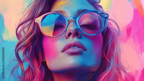 futuristic fashion portrait of a stylish woman wearing reflective sunglasses, neon color tones