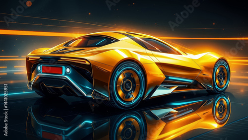 Futuristic Gold Sports Car Concept Art: Sleek Design, Neon Accents, High-Speed Vehicle, Automotive Illustration, Modern Car Design, Electric Vehicle, Luxury Automobile, Dream Car