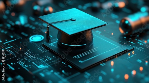 Futuristic Graduation Cap on Circuit Board Background