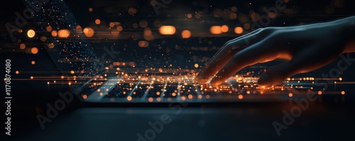 digital, technology, futuristic, hand, laptop, keyboard, glowing, interface, network, datum, innovation, computer, connection, abstract, modern, light, line, energy, science, information, future, progress, cyber, web, online, communication, electricity, spark