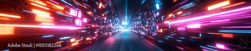 futuristic, high speed, neon, tunnel, glowing, digital, panel, holographic, effect, datum, cyber, science fiction, technology, orange, pink, blue, motion, depth, perspective, network, virtual, circuit, bright, light, streaming, cybernetic, pattern, highway, vibrant, atmosphere, blur, light, tech, speed, grid, space, modern, innovative, concept, advanced, fast, background, flooring, horizontal, illuminated, laser, no people, color image, copy space