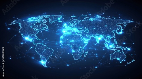 Futuristic Holographic World Map Visualization with Glowing Data Points and Network Connections, Perfect for Technology and Innovation Themes