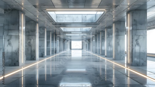 Futuristic Interior with Glossy Concrete Surfaces and Science Fiction Lighting Panels. Modern Tech Background