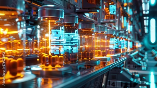 futuristic, laboratory, glowing, capsule, glasses, container, technology, science fiction, research, pharmaceutical, high technology, advanced, science, digital, innovation, automation, production, manufacturing, datum, display, biochemistry, science fiction, biotechnology, robotic, high technology, pharmaceutical industry, advanced technology, illuminated, digital display, conveyer, orange, design, ai, medicals