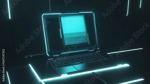 laptop, technology, futuristic, neon, light, glowing, computer, screen, design, modern, digital, interface, innovation, contraption, device, portable, tech, hardware, software, graphic, display, blue, light blue, three-dimensional, rendering, animation, studio, product, presentation, cyber, future, lighting, abstract, style, black, gaming, electronic