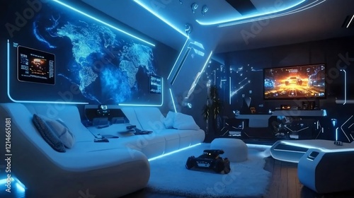 futuristic, room, interior, design, neon, blue, lighting, technology, display, sofa, white, wall, television, screen, map, earth, modern, console, game, controller, furniture, plant, light, advanced, digital, gaming, entertainment, comfortable, stylish, innovation, space, bright, virtual, atmosphere, illuminated, cool, sleek, elegant, science fiction, luxurious, concept