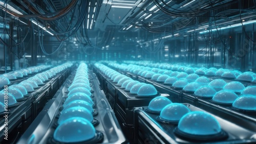 futuristic, machine, room, glowing, sphere, row, technology, metal, light, blue, clean, modern, industrial, corridor, tube, cable, smooth, bright, sleek, reflective, array, precise, system, controlled, automated, energy, tech, advanced, many, machinery, efficient, equipment, light