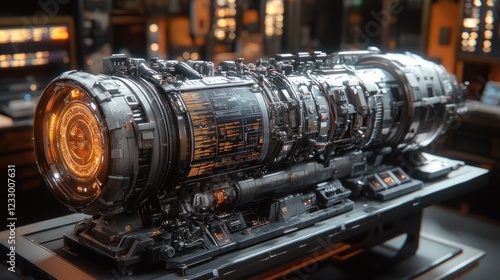engine, futuristic, technology, machine, metal, industrial, display, science, fiction, gear, mechanism, machinery, equipment, digital, screen, panel, interface, system, control, complex, intricate, detail, polished, chrome, steel, orange, glow, light, dark, background, workshop, laboratory, innovation, design, concept, power, energy, advanced, modern, robust, powerful, craft, construction, object, component, part, assembly