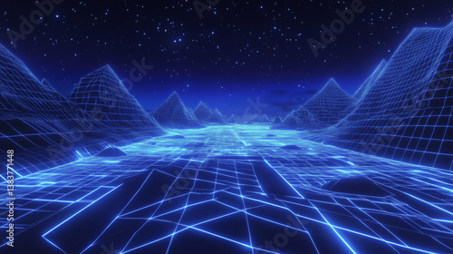 retro, futuristic, neon, grid, landscape, 80s, science fiction, digital, art, background, wireframe, mountain, night, star, blue, glowing, line, geometric, abstract, technology, pattern, texture, design, illustration, graphic, scene, environment