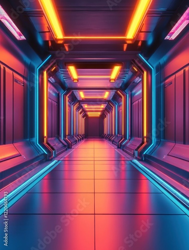 futuristic, corridor, neon, light, abstract, tunnel, perspective, glowing, hallway, technology, architecture, structure, metal, panel, design, science fiction, space, interior, pathway, modern, reflective, geometric, line, digital, art, vibrant, bright, illuminated, scene, render, three-dimensional, rendering, background, empty, pattern, surface, texture, concept, illustration, colours, blue, orange, purple, pink, symmetry, long, vision