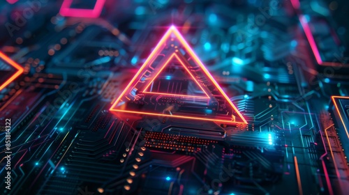 Futuristic neon triangle hologram on a high-tech circuit board, glowing in vibrant colors, representing modern technology and innovation.