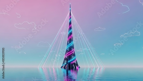 Futuristic neon-lit tower floating above reflective ocean under pastel sky