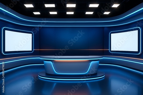 studio, futuristic, news, interior, concept, design, digital, neon, blue, light, modern, broadcast, technology, media, desk, glowing, background, television, communication, sleek, innovation, platform, information, high technology, decor, architecture, curved, environment, minimal, illumination, spotlight, entertainment, workspace, setup, contemporary, room, cyberspace, advanced, professional, stylish, electronic, layout, atmosphere, ai, generative, illustration
