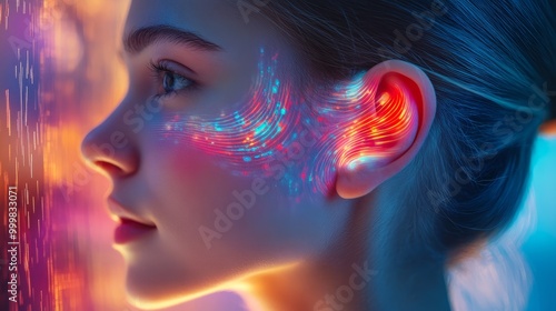 portrait, light, technology, vibrant, glow, colours, digital, fantasy, art, woman, profile, science fiction, aethereal, decorative, two-tone