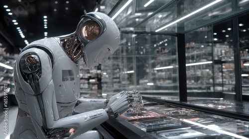 robot, android, ai, future, futuristic, technology, shopping, supermarket, store, retail, aisle, display, case, food, grocery, cyborg, machine, automation, artificial, intelligence, digital, modern, consumer, consumerism, purchase, buy, market, product, choice, selection, merchandise, shelf, shelf, metallic, metal, chrome, steel, engineering, innovation, advanced, automated, robotic, android, client, shopper, marketplace, commerce, trade
