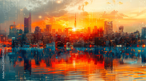 skyline, sunset, telecom, network, digital, futuristic, modern, urban, technology, city landscape, building, architecture, innovation, connectivity, cyber, city lights, metropolis, evening, urban development, high technology