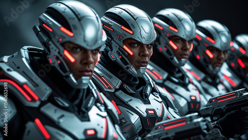 futuristic, soldier, science fiction, combat, armoring, military, elite, team, technology, warrior, space, helmet, glowing, red, accent, line, army, battle, force, group, weapon, gun, laser, ready, prepared, protection, uniform, advanced, gear, closeup, portrait, face, man, serious, digital artwork, illustration, dark, shadow, high technology, future, action, game, concept, character, posing, united