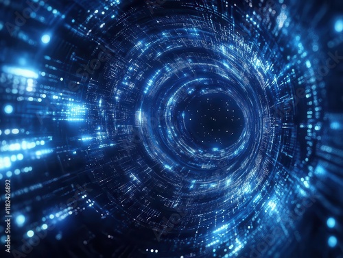 futuristic technology abstract with radial light patterns and geometric elements creating dynamic 3d effect in deep blue digital space